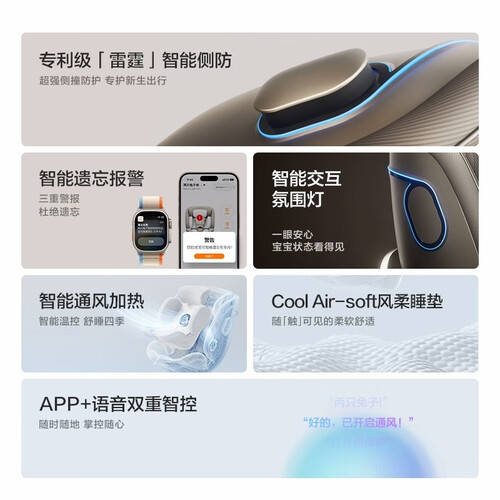 功能介绍:这款座椅不仅可坐可躺,还具备智能氛围灯,给宝宝带来更安全的乘坐体验。慢回弹记忆棉设计,让孩子在旅途中享受极致的舒适。